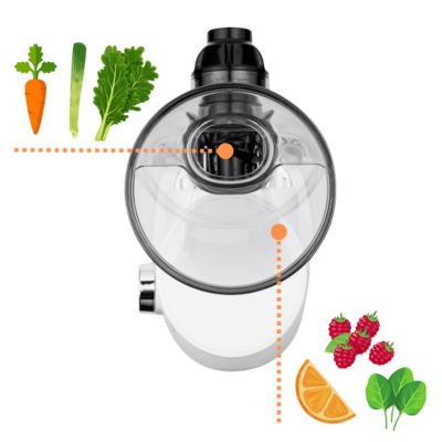 Do plnicího otvoru budete vhazovat většinu surovin, zejména mrkev, kousky jablek a ananasu nebo řapíkatý celer.