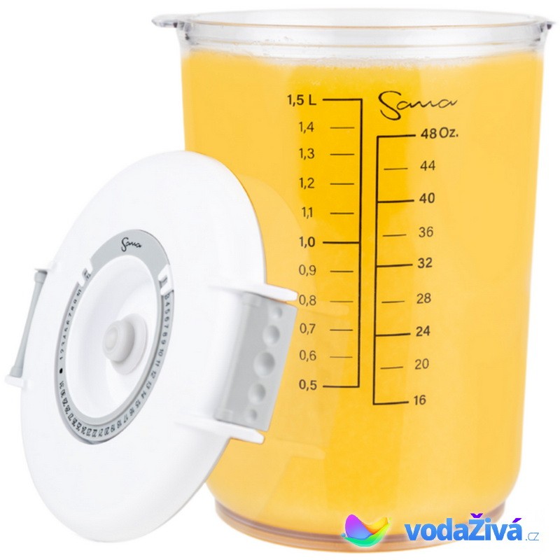 K vašemu odšťavňovači obdržíte praktickou vakuovou nádobu s objemem 1,5 litru, která je ideální pro uchování šťávy i na delší dobu. S přiloženou pumpičkou snadno a rychle odstraníte vzduch z nádoby, což výrazně zpomalí proces oxidace. Díky tomu zůstanou ve šťávě zachovány vitamíny a chuť až minimálně 24 hodin. Víko nádoby je vybaveno otočným kalendářem, pomocí kterého můžete pohodlně sledovat datum zavakuování.